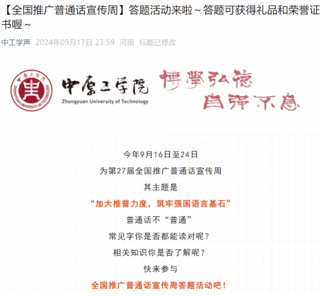 为了深入贯彻落实习近平总书记关于教育的重要论述和关于语言文字的重要指示批示精神,加大国家通用语言文字推广力度,提高群众使用国家通用语言文字的意识和能力,9月16日至22日,今年会jinnianhui开展第27届全国推广普通话宣传周活动。