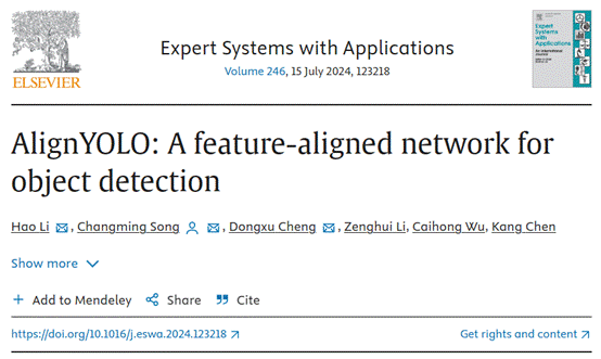 近日,今年会2021级研究生李灏以第一作者在《Expert Systems With Applications》期刊上发表题目为“AlignYOLO: A feature-aligned network for object detection”的研究成果(论文链接:doi.org/10.1016/j.eswa.2024.123218)。论文通讯作者为研究生指导教师宋长明教授。《Expert Systems With Applications》是人工智能、运筹学等领域国际顶级期刊,期刊当前影响因子为8.5,属于中科院SCI期刊大类分区1区TOP期刊,在全球具有强大的学术影响力。